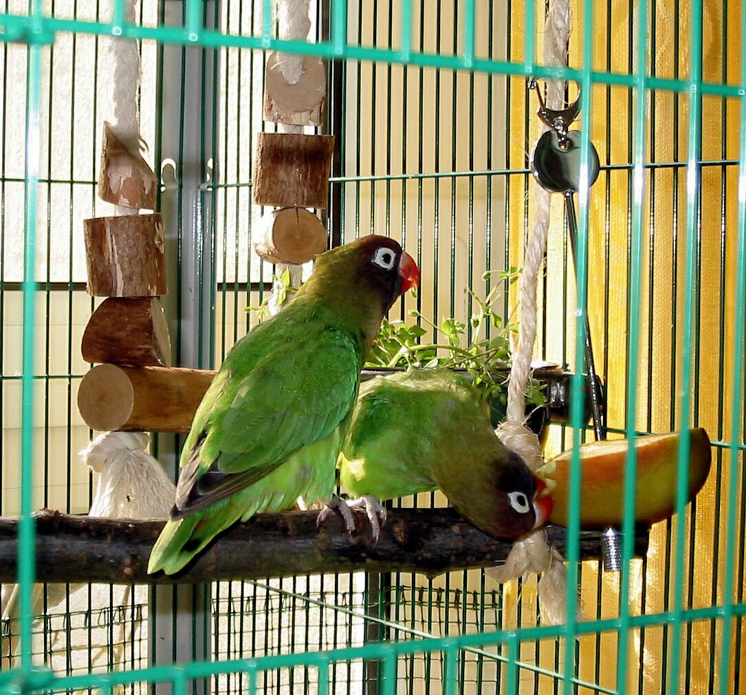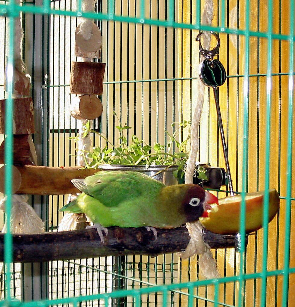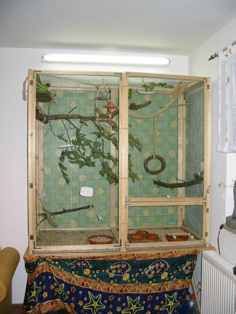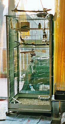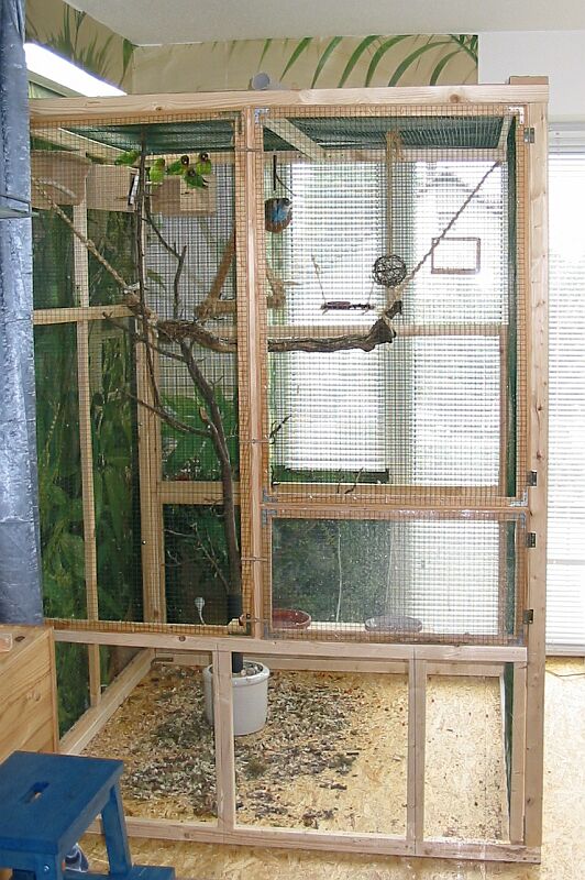 2003 - Nach dem sich mein Vogelbestand nun auf 6 Voegel eingependelt hat, brauchte ich eine grössere Voliere. Da ich zum Teil sehr wenig zu Hause bin und die Kleinen auch dann genug Platz haben sollen, um mal ein bisschen hin und her zu fliegen, musste also mehr Platz her. Gesagt, getan und innerhalb von 3 Tagen wurde diese Voliere gebaut - Masse HxBxT 200x150x150 cm Die Teile der alten Voliere wurden mit verbaut. | |